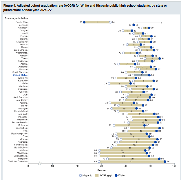 The evidence showed that 1/3 of U.S. students attend a school that is the same race. In the article from NPR named The U.S. student population is more diverse, but schools are still highly segregated, they mention that “more than a third of students (about 18.5 million of them) attended a predominantly same-race/ethnicity school during the 2020-21school year” (Sequoia 2022). These divisions make it to where people in poverty are concentrated in limited school systems. The course work of poor schools is less advanced and therefore does not prepare students for educational advancement. We saw how the statistics show that the children of Raza have continued to persevere and graduation rates have continued to rise despite this inequality. This matters because 83% of Hispanics graduate high school compared to their non-Hispanic white peers who graduate at 90%.