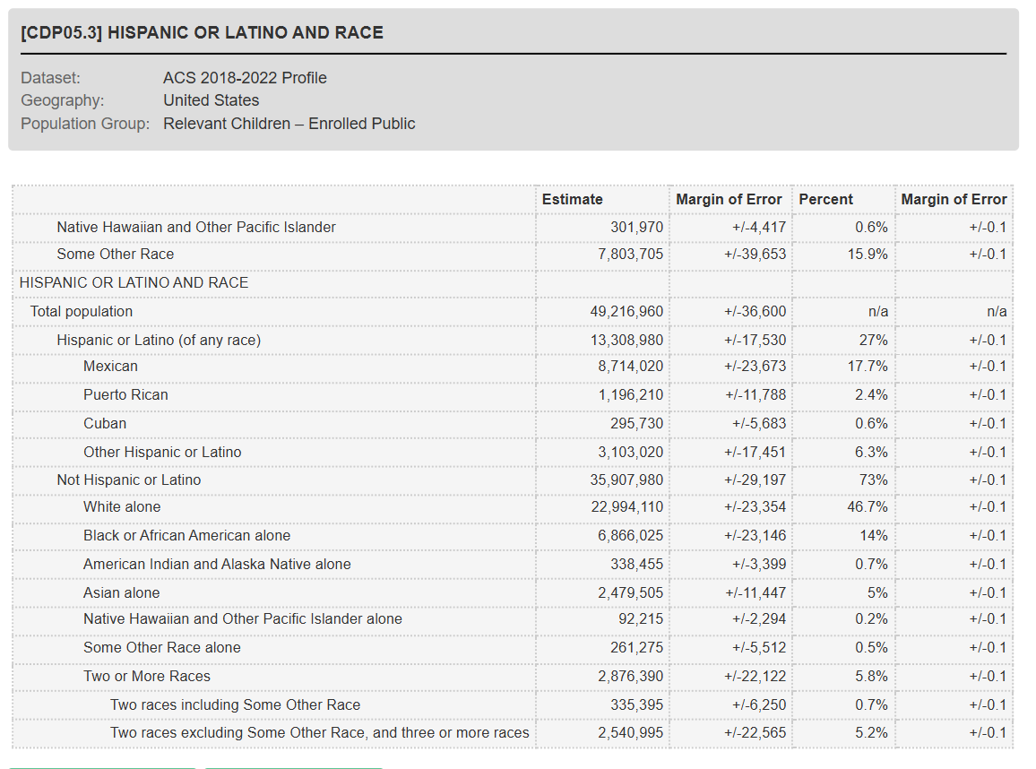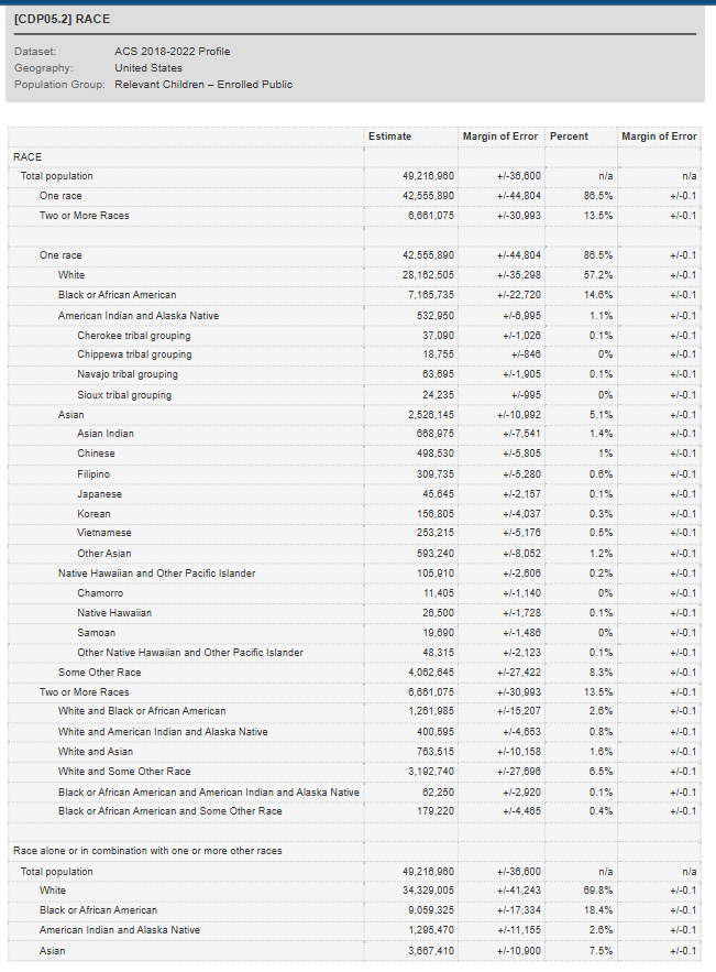 Another important point is that since Hispanic and Latino are ethnicities, they are allowed to be a subcategory of the white race. This is because the Treaty of Guadalupe suggested that Mexicans had white status because, at the time, you had to be white to be naturalized. Shouldn’t Raza be a part of the American Indian race since that is their actual race? In the two tables below, we get a glimpse of the manipulation and confusion caused by this phenomenon. In graph CDP05.3, it’s easy to see that Hispanic and Latino enrolled students amount to 13,308,980 and whites alone make up 22,994,110. Now look at the next graph, CDP05.2, which separates people based on race. Where are the Latino and Hispanic students located within these numbers? I could not make the math work between the two graphs. La Raza means Indigenous American, which is known in government treaties as American Indians.