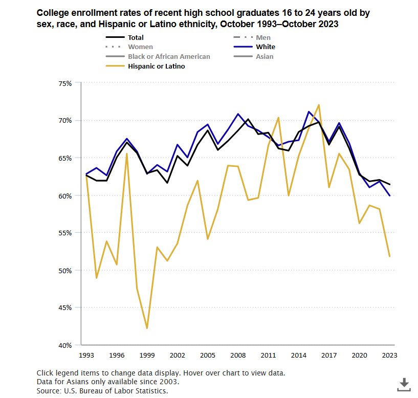 Bureau of Labor Statistics, U.S. Department of Labor, The Economics Daily, 61.4 percent of recent high school graduates enrolled in college in October 2023 at https://www.bls.gov/opub/ted/2024/61-4-percent-of-recent-high-school-graduates-enrolled-in-college-in-october-2023.htm (visited March 04, 2026).